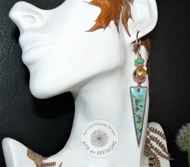 Du vert légèrement bleuté sur du cuivre brillant, un style tribal chic pour ces longues boucles absolument uniques, qui n'attendent plus que vous ! Très légères à porter.