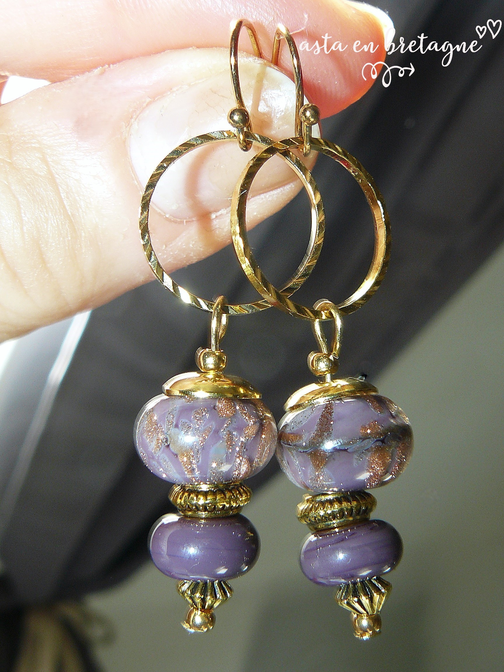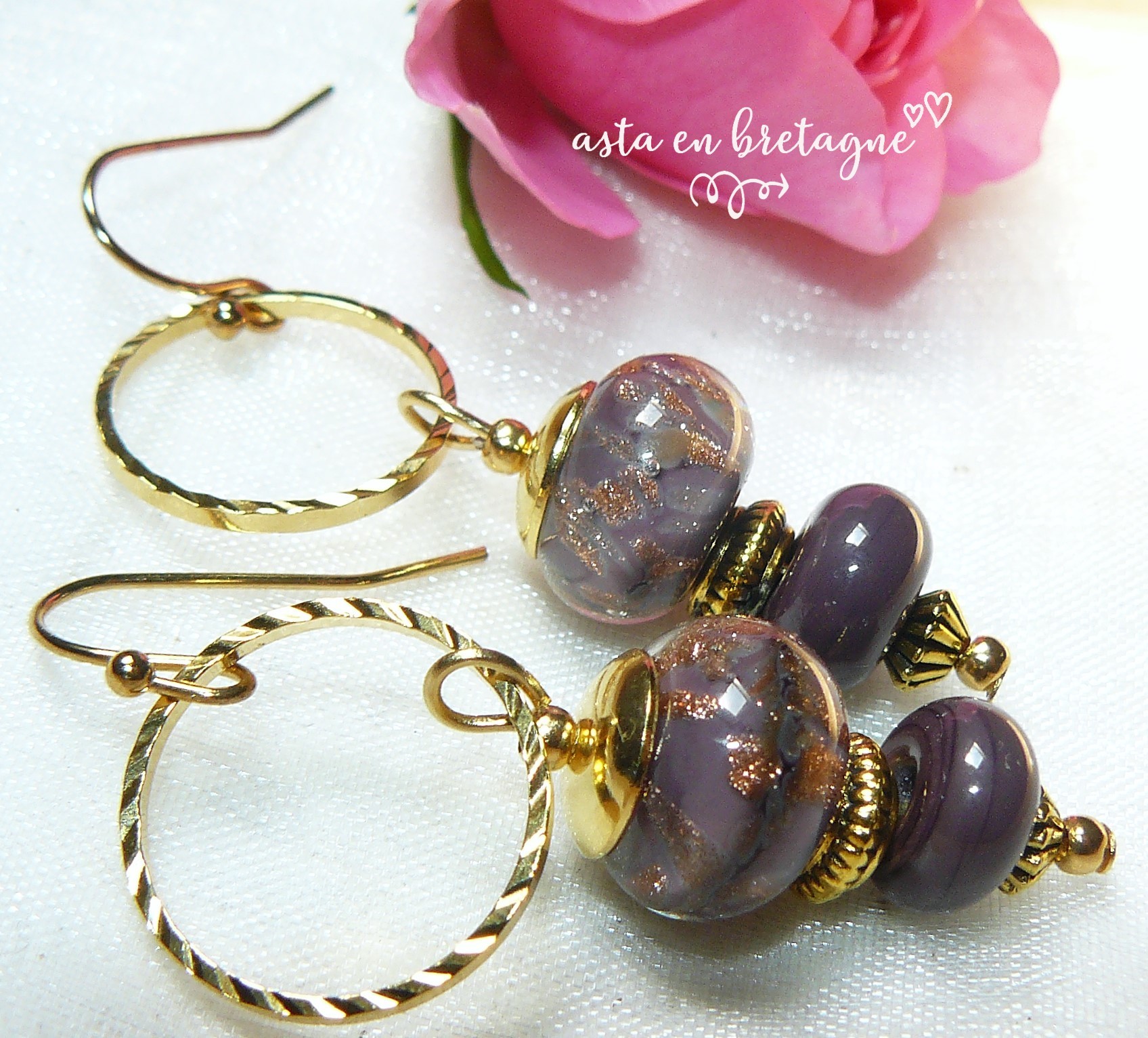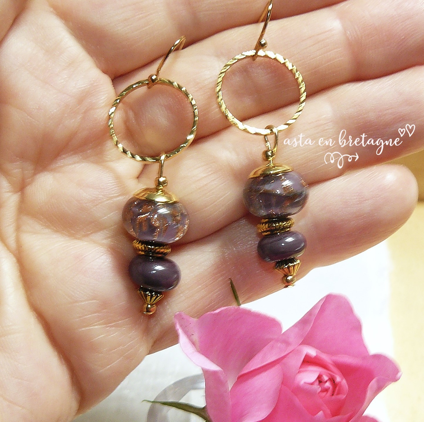 Elégantes et faciles à porter ces boucles avec leurs perles en verre filé à la flamme dans des tons prune parsemés d'éclat dorés...