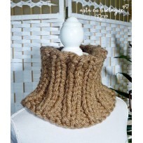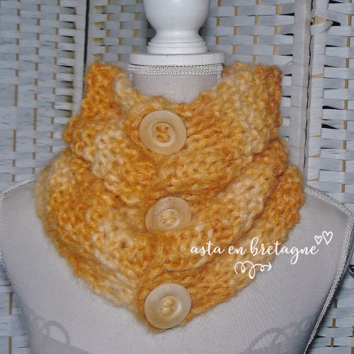 ► une laine spectaculaire qui lui confère toute son originalité : un mélange de mèches bayadères multicolores, de mini-pompons et un fin fil lurex or. Les couleurs sont chatoyantes, dans les tons ocre, marron clair, marron foncé, orange et blanc, le fil est parsemé de petits pompons blancs, oranges et bruns. Au moindre rayon de soleil ou à la lumière, ce snood s'illumine ! Les photos ont d’ailleurs du mal à lui rendre justice... Difficile de faire apparaître ce petit éclat discret que lui donne le fil d'or.